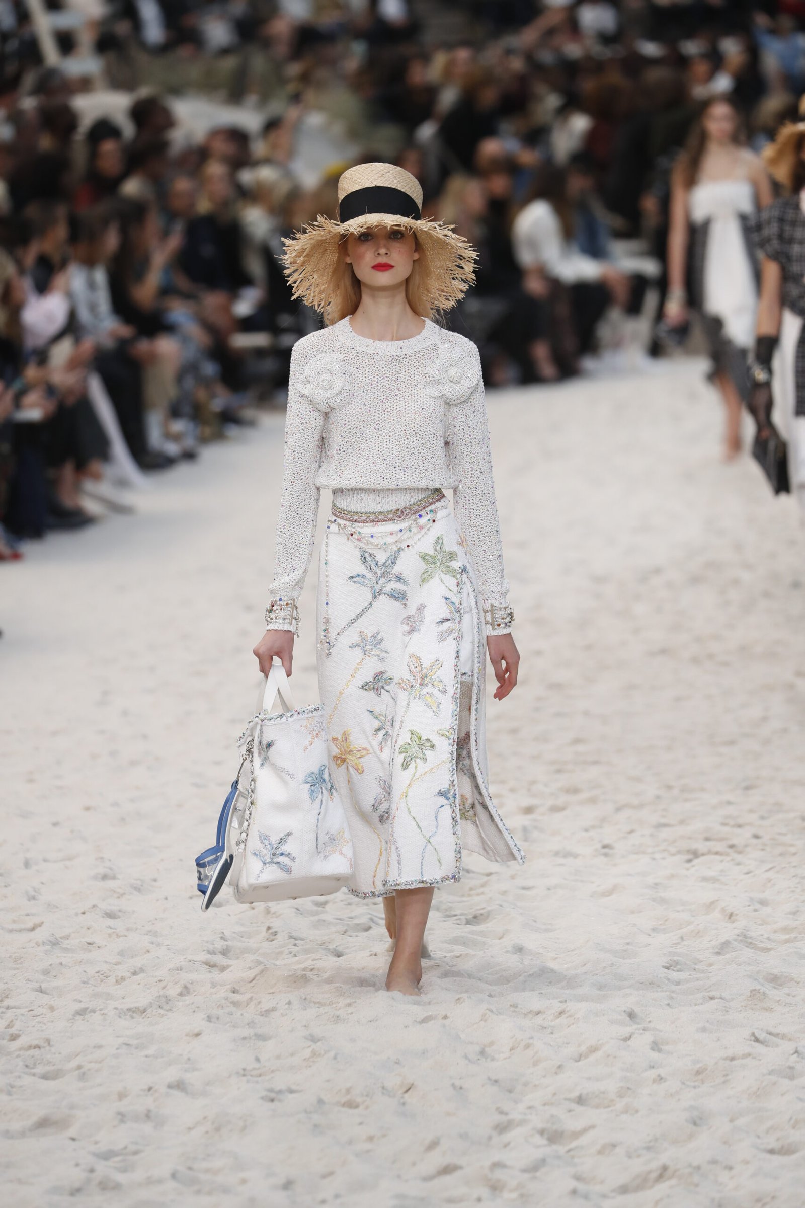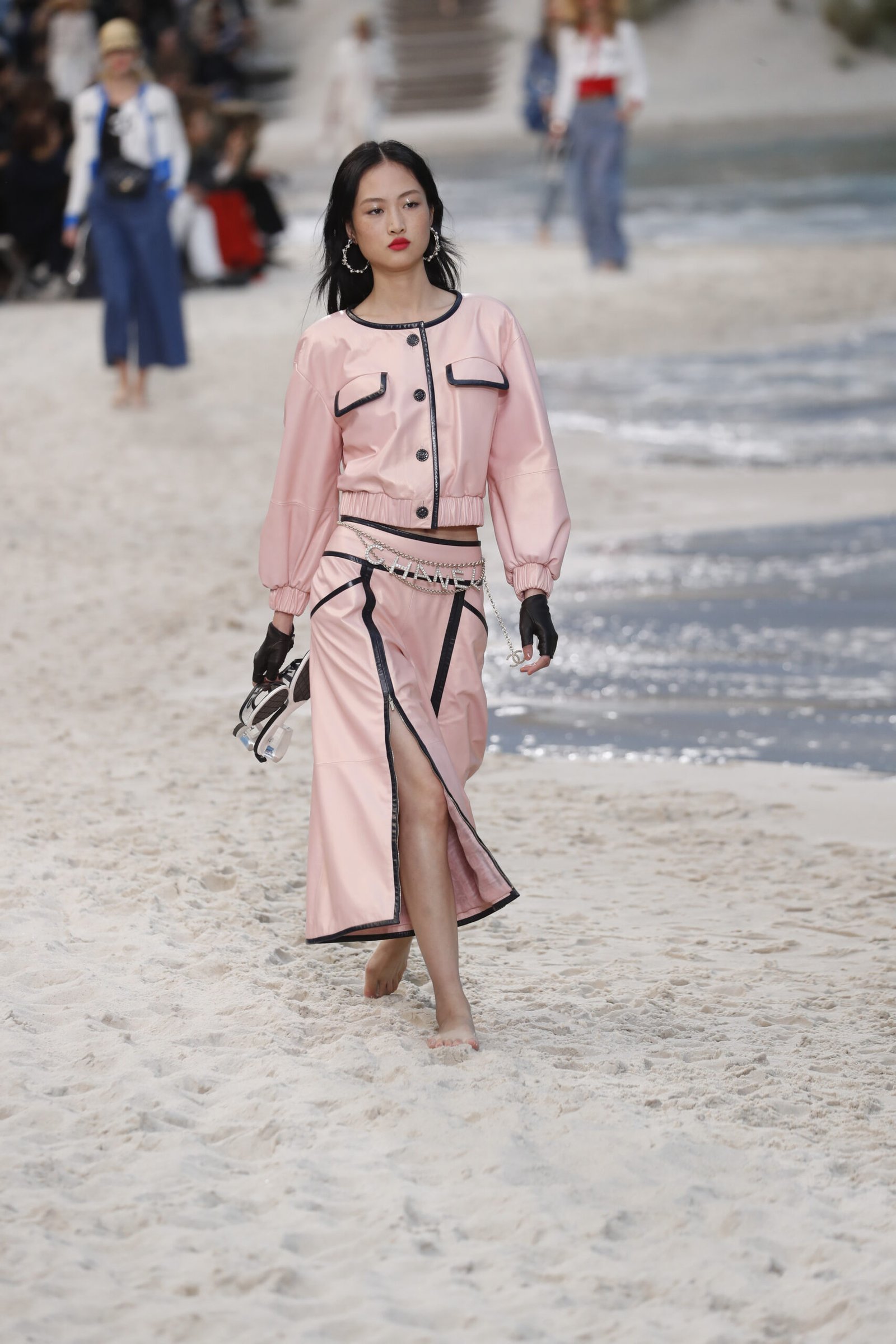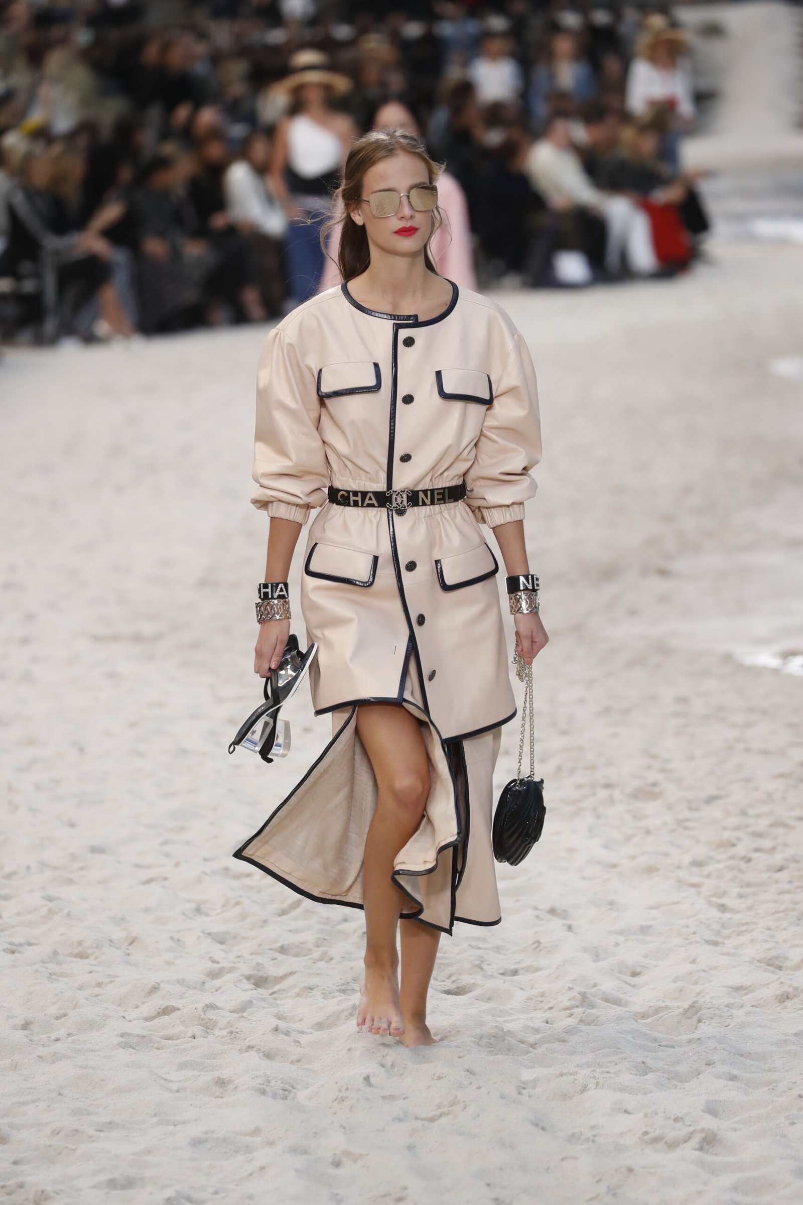 Accessoires spielten eine zentrale Rolle und verliehen jedem Look einen Hauch von Luxus: Kettengürtel, breite Armbänder und große Sonnenbrillen sorgten für eine Prise Glamour. Besonders auffällig war das barfüßige Styling der Models, die über den Sand liefen und ihre Schuhe teilweise in der Hand trugen, was eine lässige Urlaubsstimmung vermittelte und Chanel’s Anpassungsfähigkeit zeigte. Die Kollektion umfasste zudem fließende Sommerkleider und strukturierte Jacken, die von modernen, minimalistischen Schnitten bis hin zu detailreichen Verzierungen reichten.