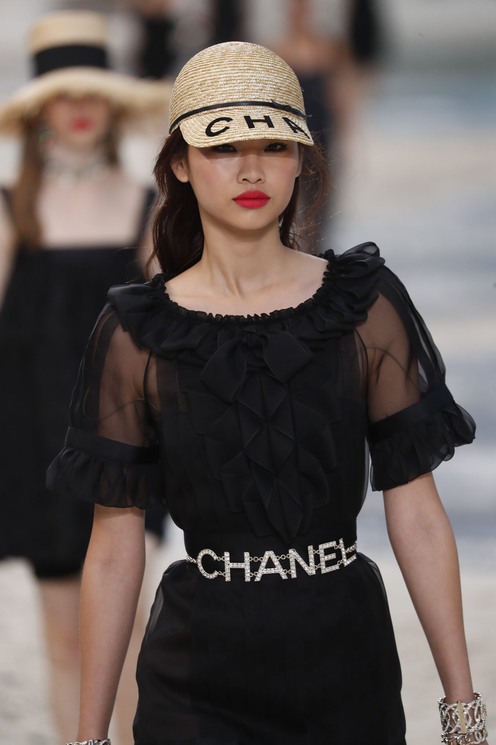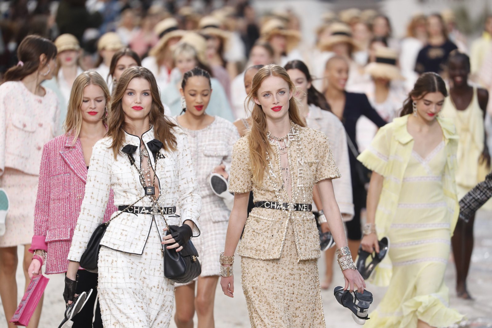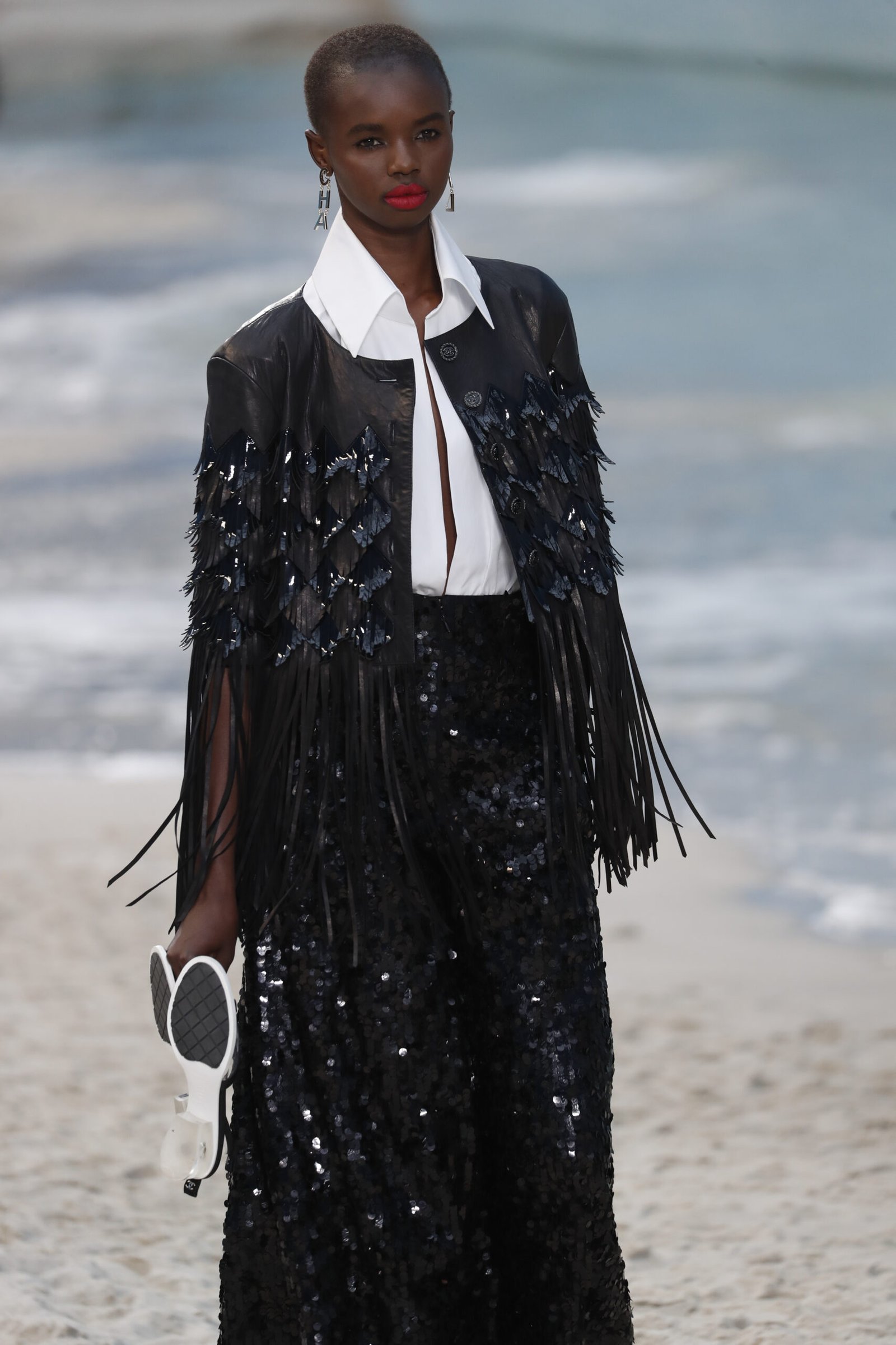 Accessoires spielten eine zentrale Rolle und verliehen jedem Look einen Hauch von Luxus: Kettengürtel, breite Armbänder und große Sonnenbrillen sorgten für eine Prise Glamour. Besonders auffällig war das barfüßige Styling der Models, die über den Sand liefen und ihre Schuhe teilweise in der Hand trugen, was eine lässige Urlaubsstimmung vermittelte und Chanel’s Anpassungsfähigkeit zeigte. Die Kollektion umfasste zudem fließende Sommerkleider und strukturierte Jacken, die von modernen, minimalistischen Schnitten bis hin zu detailreichen Verzierungen reichten.
