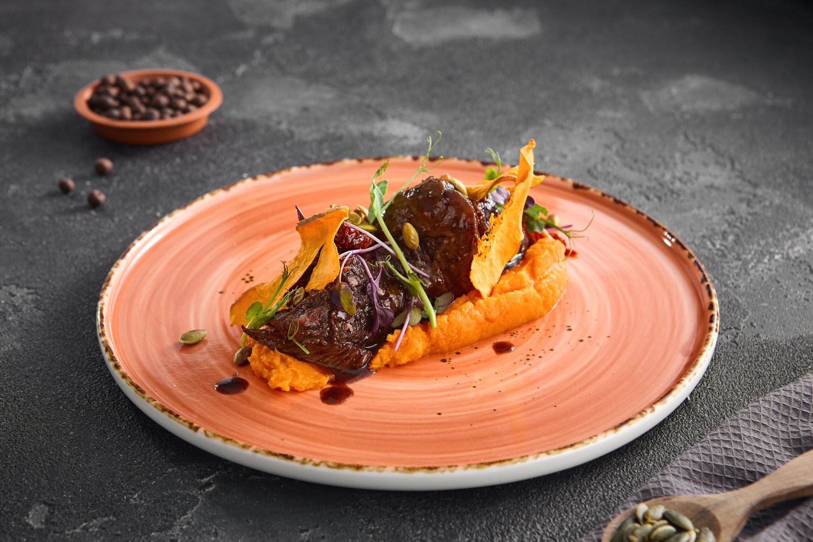 Hauptgang: Zarte gebackene Rinderwangen auf glattem Kürbispüree mit Mikrogrün