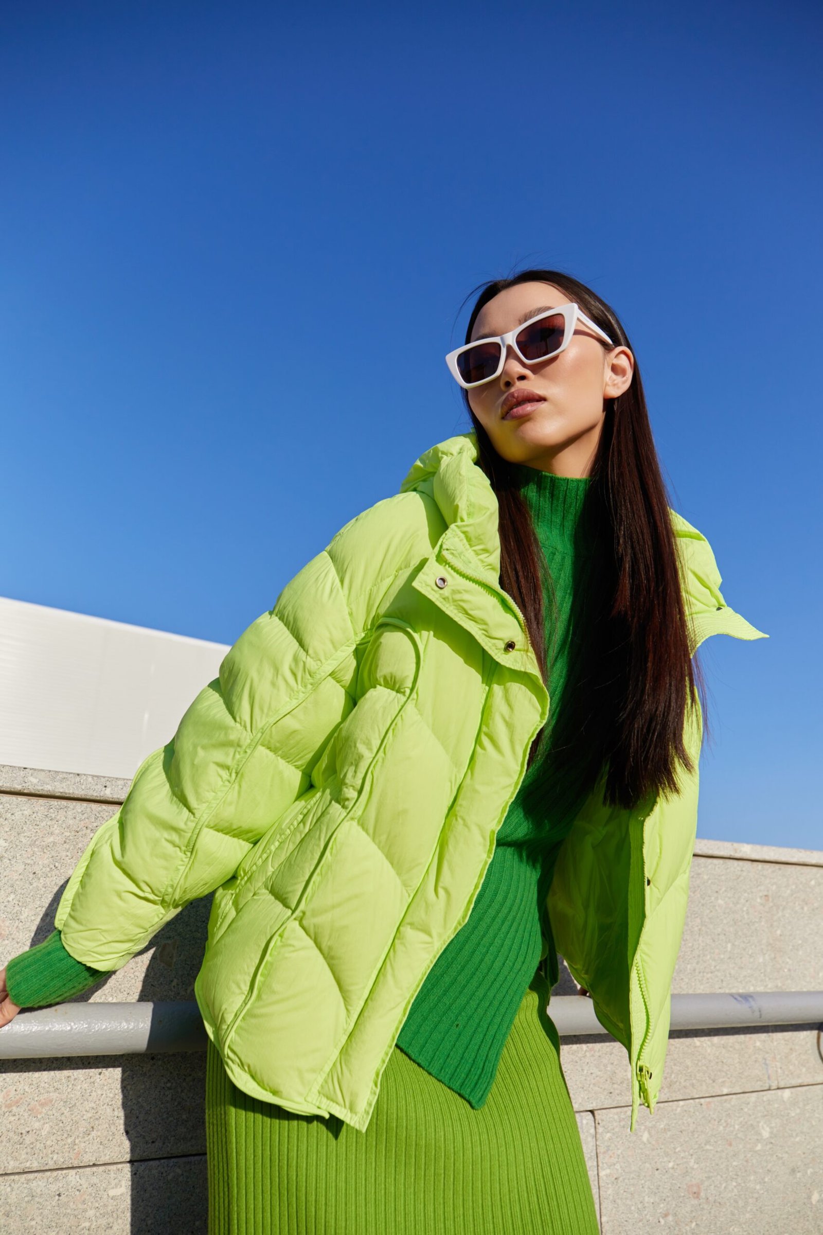 Monochromatischer Look mit grüner Daunenjacke. Ein weiteres Ensemble, das die Influencerin präsentiert, ist ein monochromatischer Look in Grün. Sie trägt eine stilvolle grüne Daunenjacke, die sie warmhält und gleichzeitig eine trendige Aussage macht. Darunter kombiniert sie einen grünen Rock mit einem passenden Pullover, der das Ensemble komplettiert.