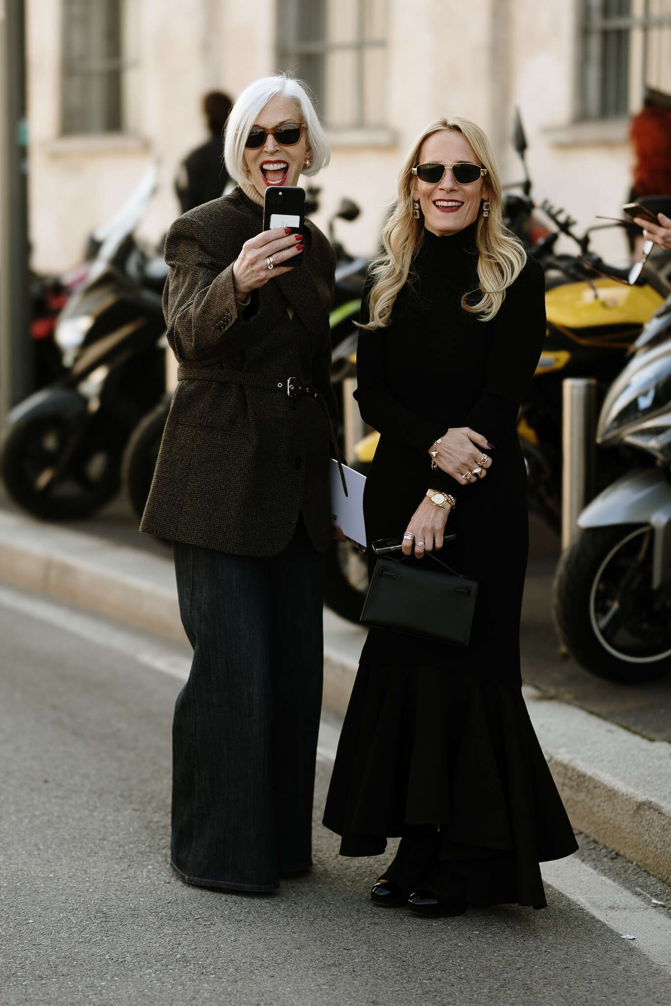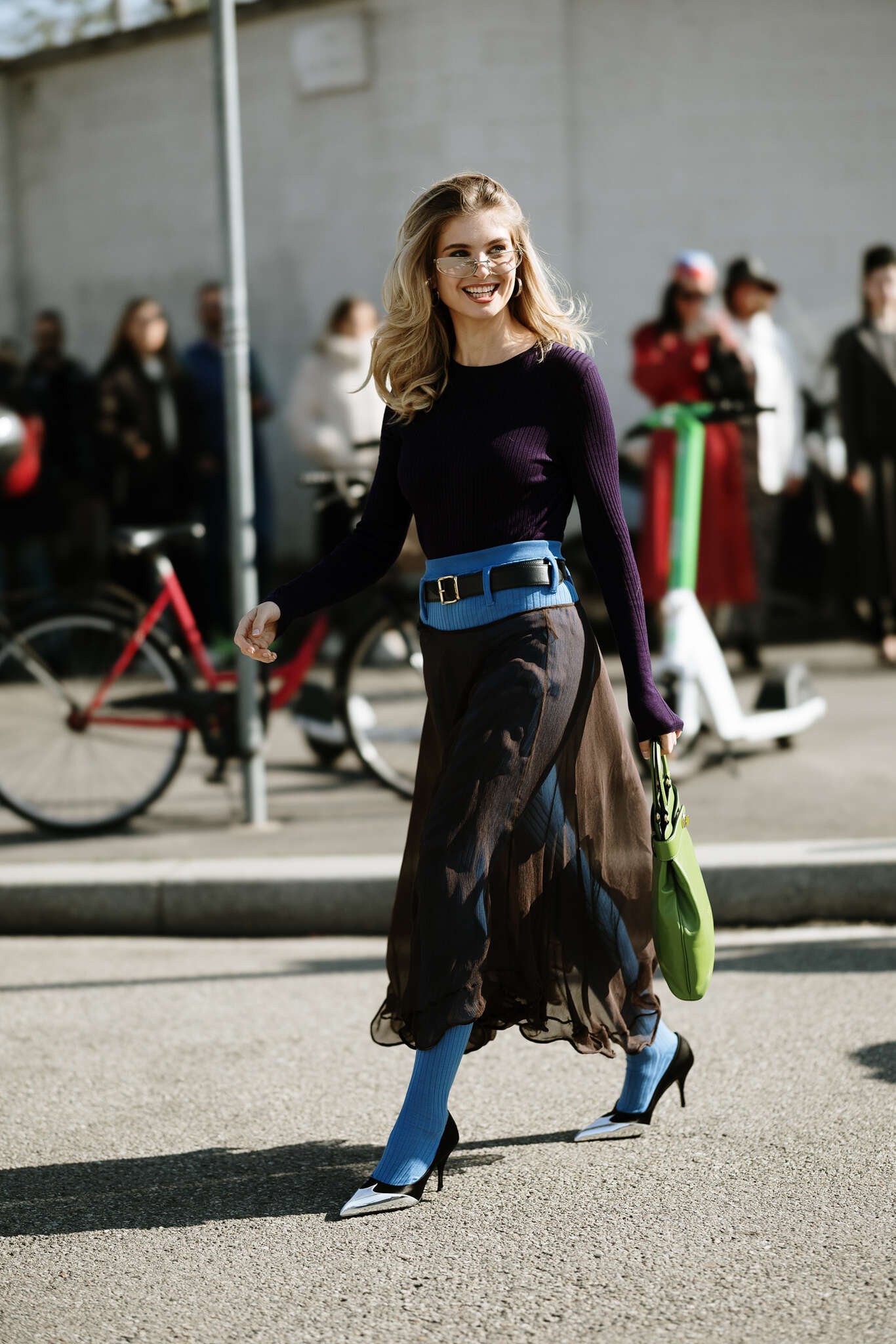 Und dann sind da die Stilmutigen: transparente Röcke über Strumpfhosen, leuchtende Farben zu neutralen Basen, Neon auf Pastell. Accessoires werden zum Signal: spitz zulaufende Pumps, Mini-Bags in Giftgrün, Gürtel in Blockfarben, extragroße Sonnenbrillen – sie sprechen dieselbe Sprache: Präsenz.