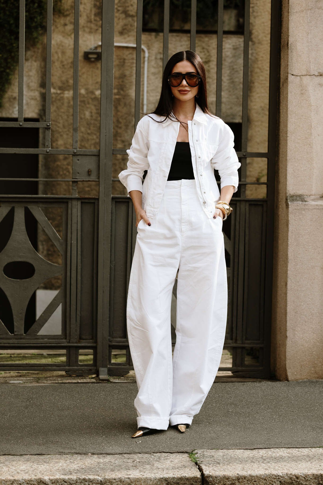 Unangestrengte Coolness zeigt sich auch in White-on-White-Looks, bei denen Schnitt, Struktur und Haltung die Hauptrolle spielen. Oversized Denim-Jacken, weite Marlenehosen und goldene Details lassen Schlichtheit aufregend wirken. Und selbst der klassische Trench erfährt ein Street-Update – mit Layering, knitwear-draping und monochromen Understatements.