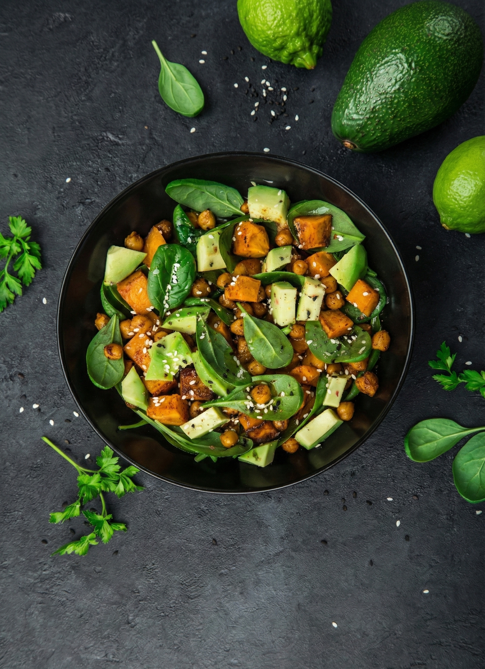 Avocado, Quinoa, geröstete Süßkartoffel, Spinat- und Kichererbsensalat