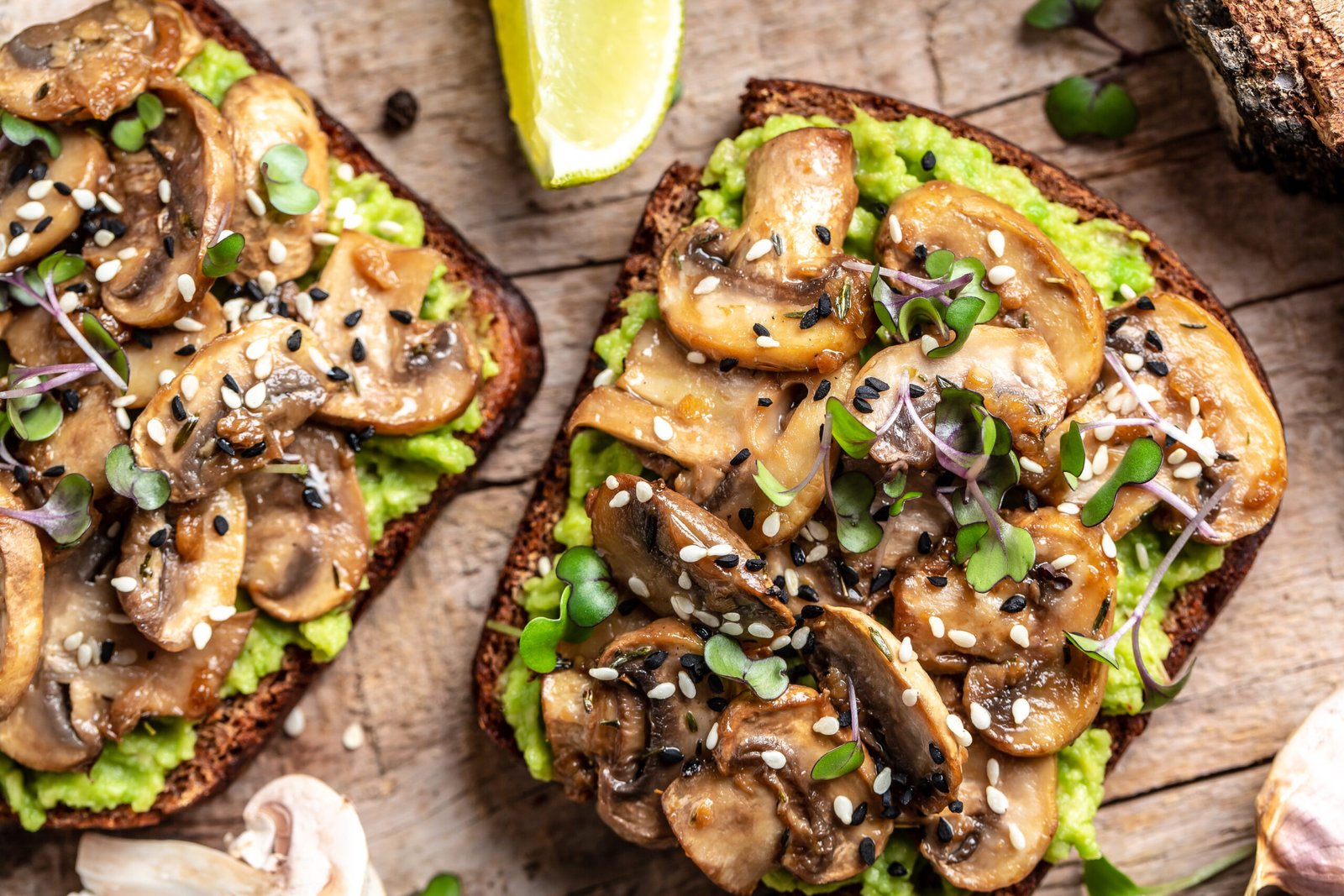 Getoastetes Vollkornsandwich mit Avocado, Champignons und Grünzeug, dekoriert mit einem Hauch Sesam