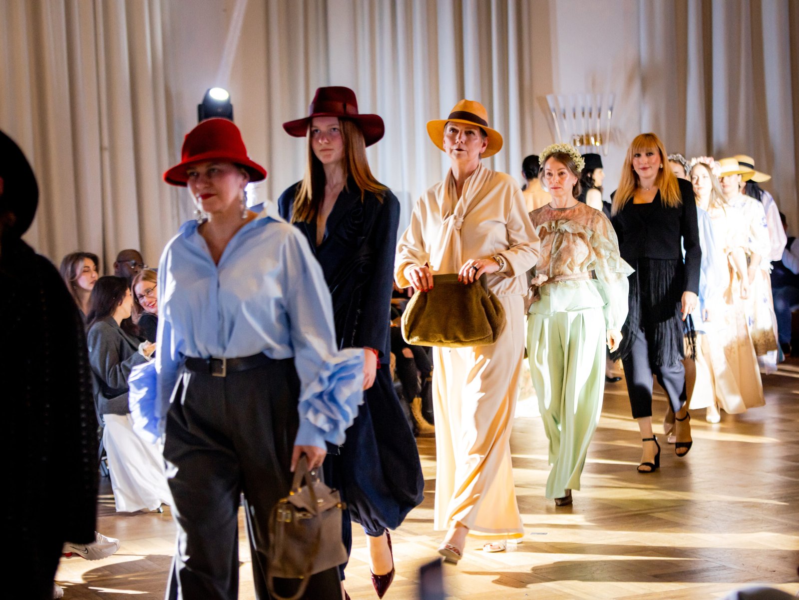 Die Verbindung von Klassik und Moderne zieht sich durch die gesamte Show. Tailoring-Elemente und klare Linien werden mit unerwarteten Details kombiniert – asymmetrische Schnitte, auffällige Applikationen oder verspielte Accessoires wie Hüte und Taschen verleihen den Looks eine individuelle Handschrift.